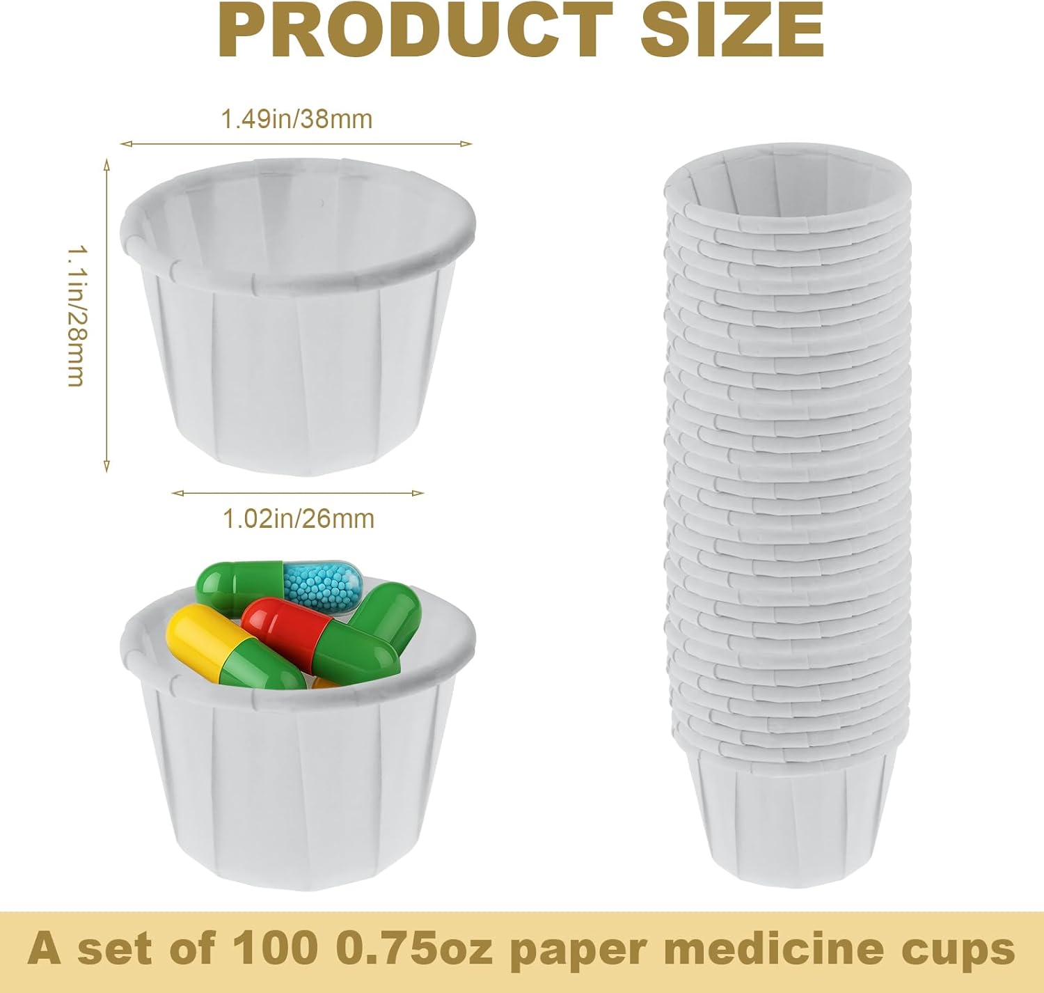 100 Paper Medicine Cups Small Disposable Paper Condiment Cups for Pill Samples, Medication Distribution, Food, Dessert Service (0.75 oz)