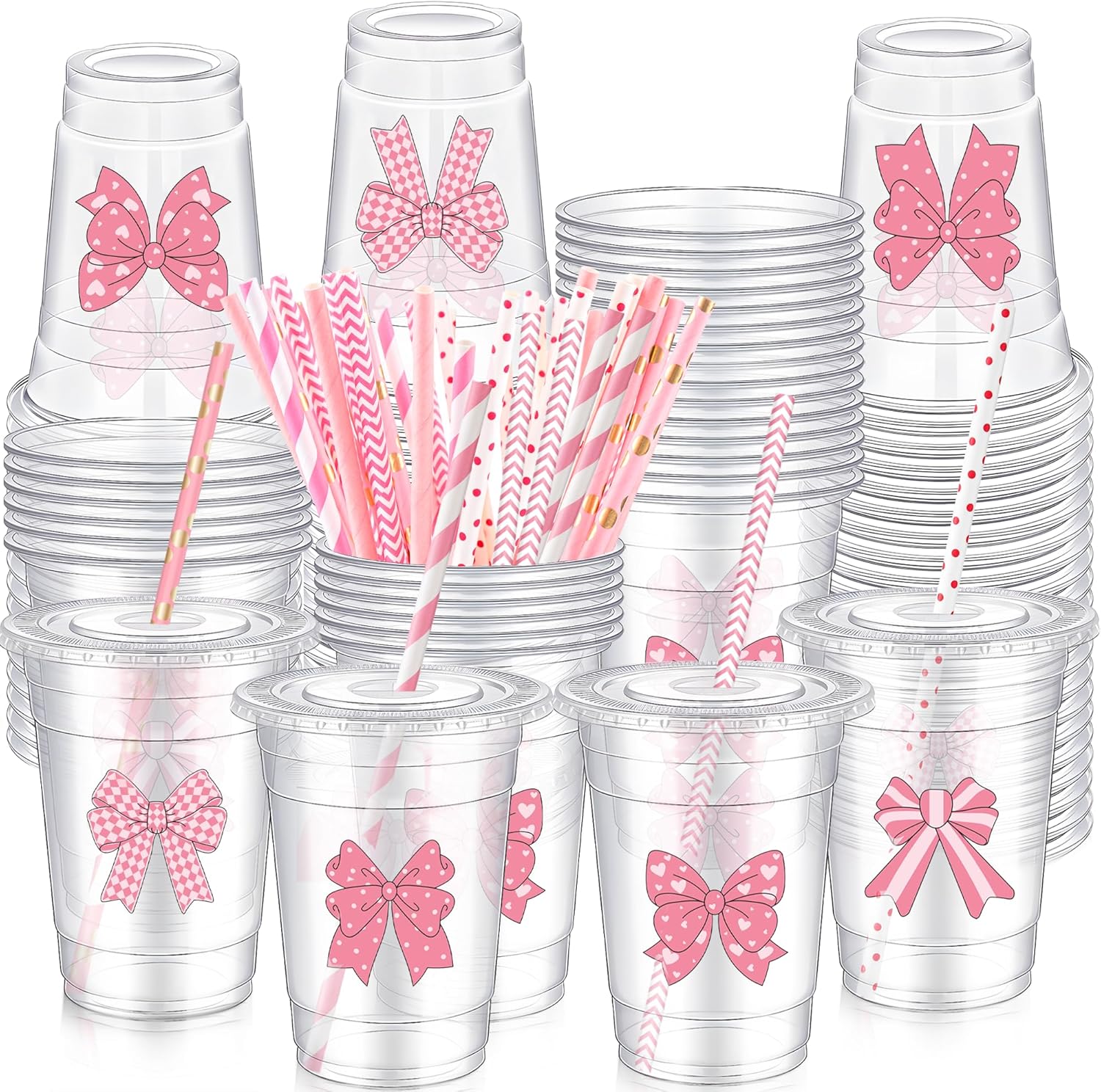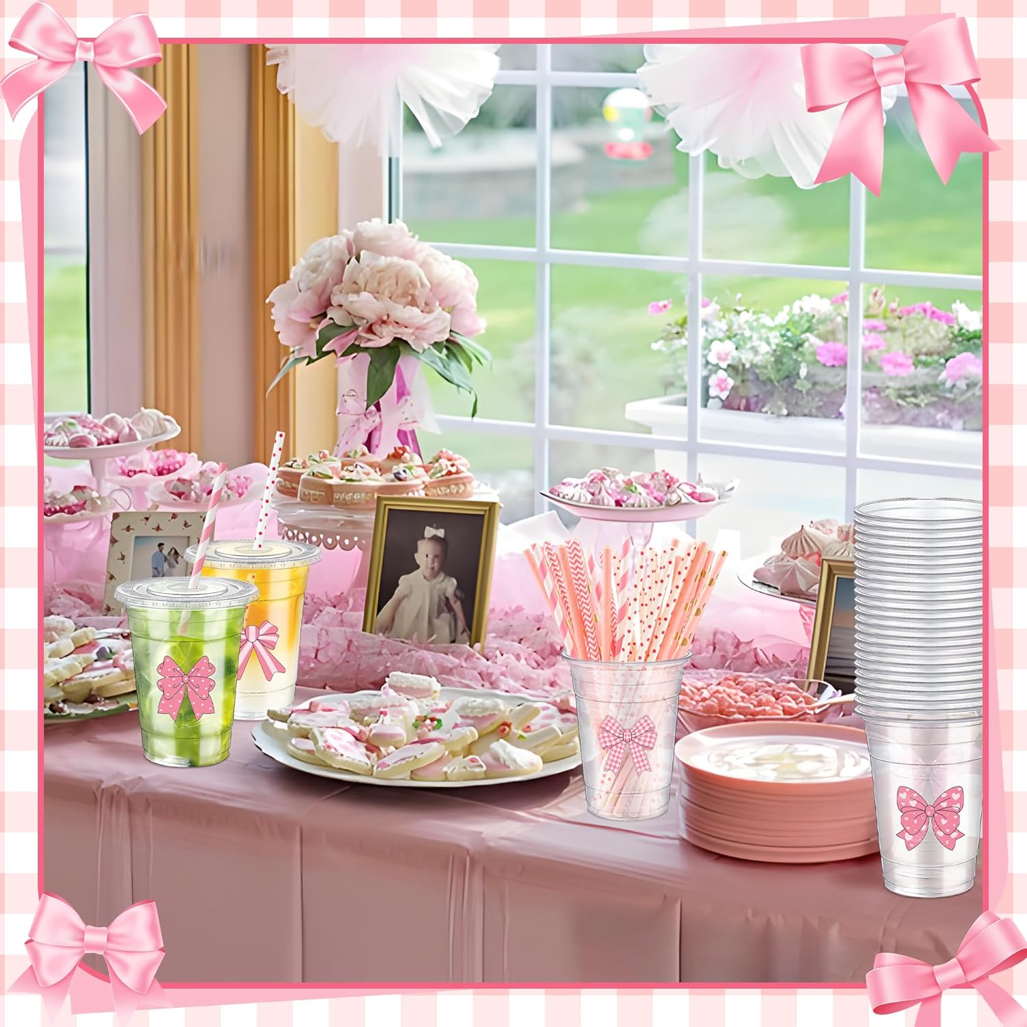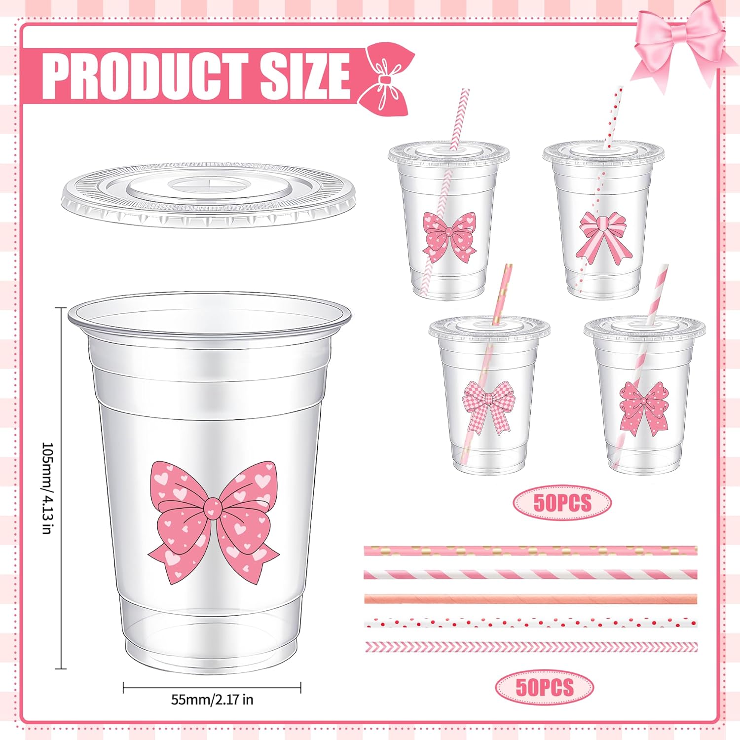 50 Sets Pink Bow Plastic Cups with Lids and Straws 12 Ounces Cute Bow Transparent Disposable Cups Bow Theme Birthday Decorations for Hot Drinks Cold Drinks Bachelor Party Pink Baby Shower